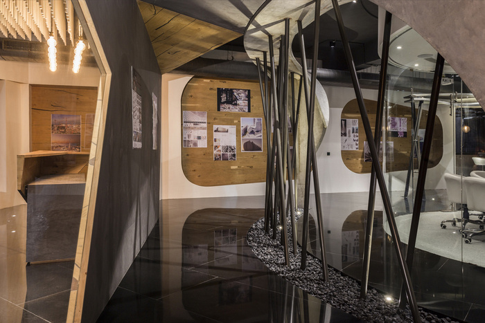 办公室的入口由一扇 9 英尺 x 6 英尺宽的旋转金属门定义,设计由锥形金属管组成。接待区采用参数化设计的装置,使用 1500 根圆形杆悬挂在天花板上的有机波浪结构中。在广阔的空间中创造戏剧性,会议两侧是采用特殊施工技术和加固方法设计的三维曲线结构。黑色镜面花岗岩地板将办公空间的各种元素结合在一起。#办公室空间设计案例#