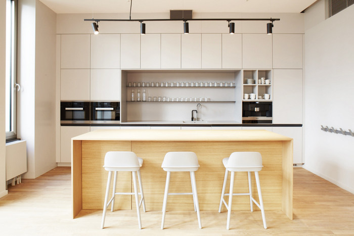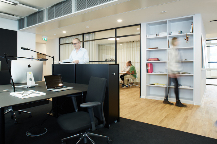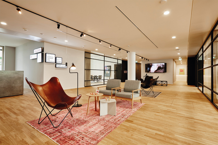 为了不仅支持个人而且支持组织的创新精神和工作流程,已经安装了用于快速和自发演示和聚会的场所?;嵋槭业纳杓朴斐鐾ǚ绲姆瘴?,以促进同事之间的交流。#办公室空间装饰#