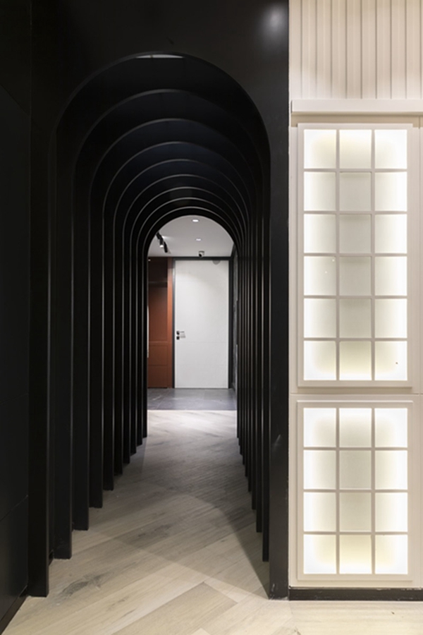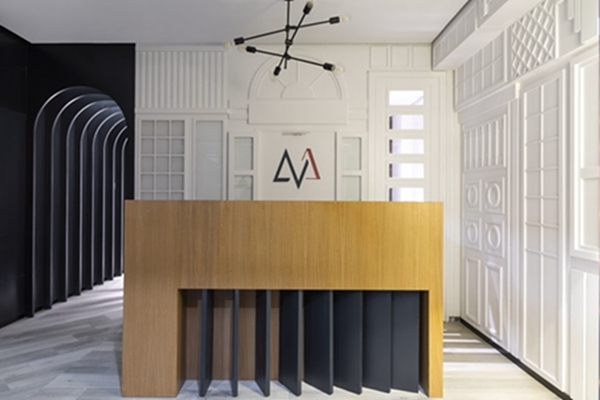 来自世界各地的门板为红橡木接待台形成了纯净的白色背景,到了晚上,这种白色的大元素就像灯笼一样反射着自己的光。#办公室装修风格#