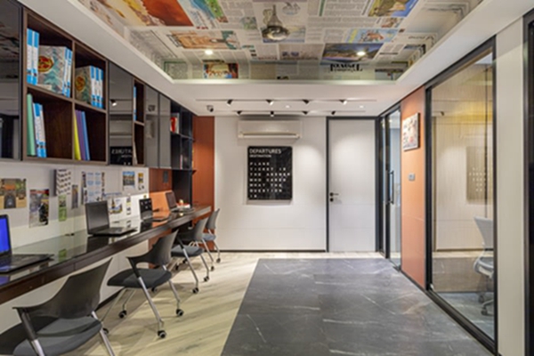 窗户安全格栅与阳光共同作用,在静音百叶窗上产生阴影和城市天际线的投影,给人以时光错位感。定制的货币地图牢固地坐落在董事的一个小木屋中,在多功能工作区的天花板上,放大了各种旅行用品和杂志柱,这些元素造就了旅行的怀旧感,并构成了美丽的“办公室旅行记录”。#办公室装修案例#