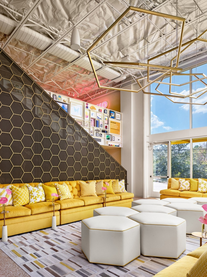 《蜂巢》的图形和整体风格的愿景受到各种灵感照片的影响,设计师将六角形墙布和以生活方式为中心的环境的愿景变为现实。#办公室装修设计公司#