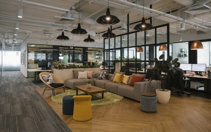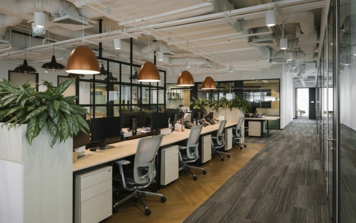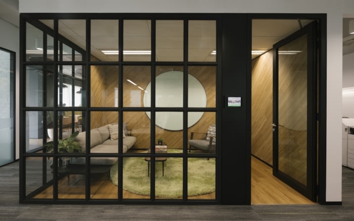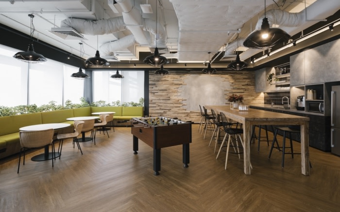 材料和调色板被认为是对公司理想的补充。大多数颜色都保留在铁锈、绿色和天然材料的泥土色系,而舱室中的砖墙则打破了典型办公空间的单调性。#办公空间设计案例#