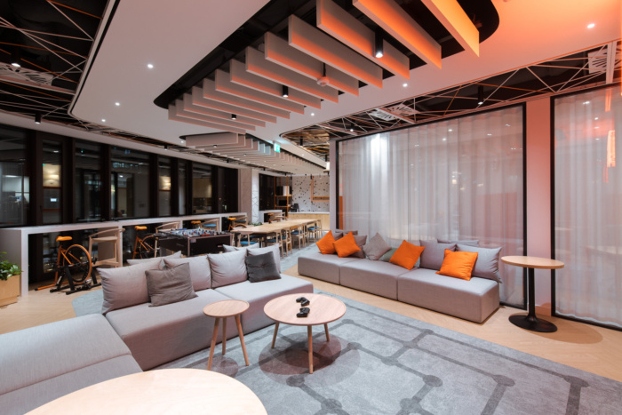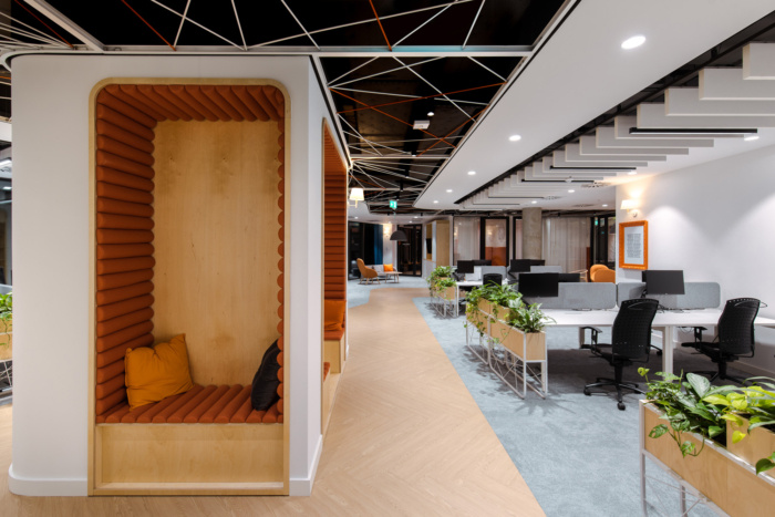 接待区也是居家般的家具美学与独特的绳索图案、郁郁葱葱的绿色植物、圆形和微妙的色彩运用以及企业品牌的完美结合??悸堑讲A磺椒考涞纳Ч?,很多地方都使用了柔软的窗帘,这也符合居家的美学主题。此外,一些墙壁,尤其是会议室的墙壁,已经安装了柔软的声学泡沫滚轴。#公司办公室装修设计#