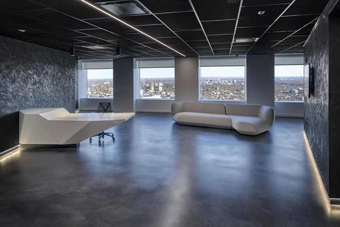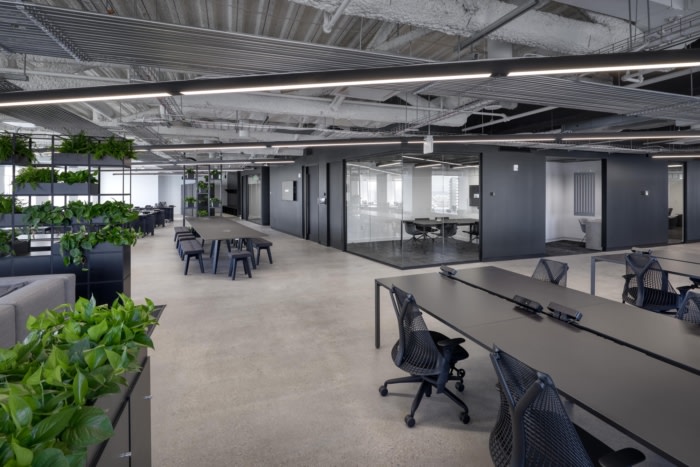 工作空间采用密封混凝土地板、吊顶筏板和网布等城市材料。用户从一个非常暗的接待处和会议区和大区域发展到越来越明亮的空间,因为他们更深入办公室并同时靠近建筑物的周边,直到遇到原始的白色工作空间和市中心与附近街区的壮丽景色山脉。#办公空间设计装修#