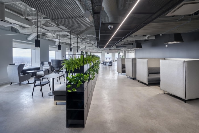 WTech 的 Smartengine 智能照明使用传感器来监控周围的光线水平并模仿自然日光,即使在建筑环境中也能保持昼夜节律不变。相同的传感器还可以获取空间使用信息,让 Gymshark 能够监控办公室占用率和效率,同时将能源使用量减少 90%。#办公空间设计装修案例#