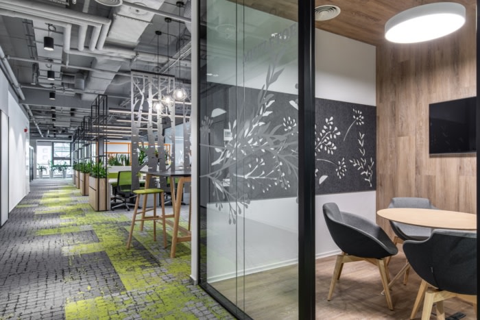 通过使用仿生学,设计师将有机形状的概念家具、受流体树枝启发的玻璃隔断箔、具有自然图案的地毯、唤起城市与自然环境之间同样强烈联系的地毯纳入概念家具中。漆成灰色的深色裸露天花板用作背景,以强调白色墙壁增强的自然采光。合作区由种植活植物、花盆和活墙的绿色角落完成。#办公室装修公司#