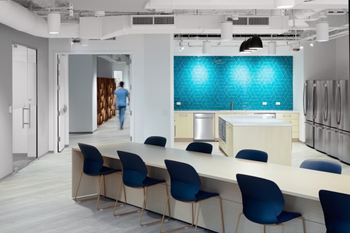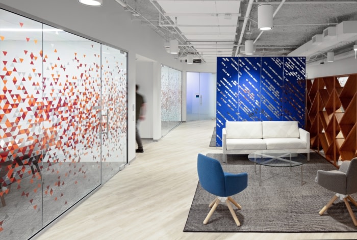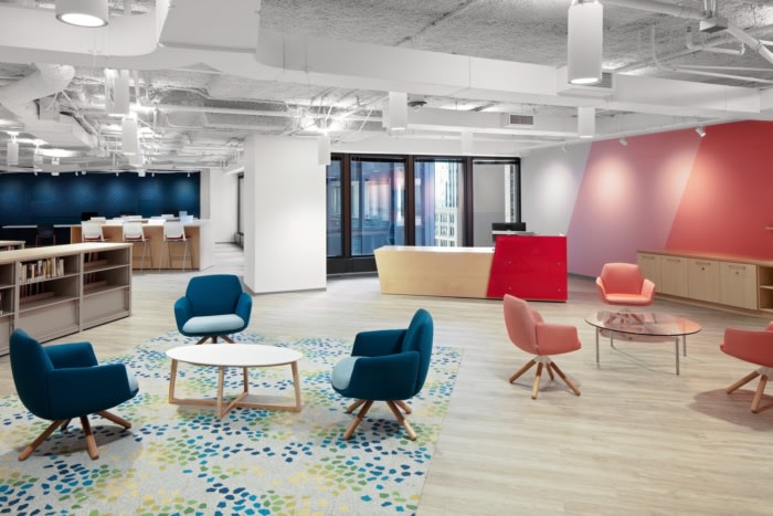 这就是万花筒灵感最闪耀的地方——包括橙色、红色和蓝绿色在内的多种颜色融合在一起,展示了社区的多样性。设计团队战略性地将图书馆放置在接待区和工作区之间,以确保员工每天都需要通过它才能进入收发室、印刷室、咖啡厅和会议室。#办公室设计装修公司#