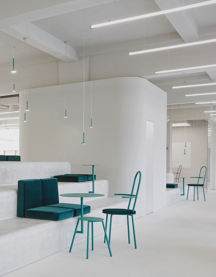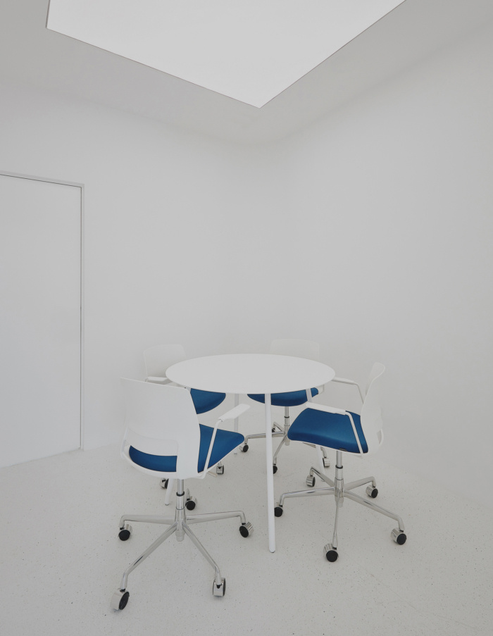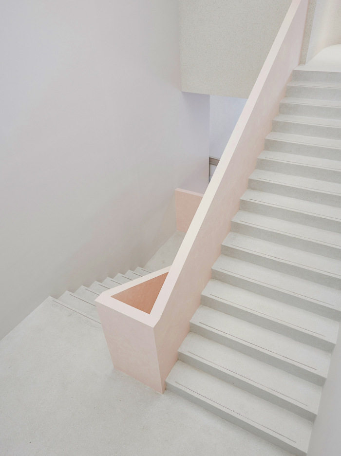 简单的空间,简单的规则。内部是干净的和简单的。不同高度和不同材料的街区为整个开放空间提供指导,例如厨房、会议室、展示墙或中央封闭房间的隐私。颜色在结构中保持非常中性,为接待处染成蓝色的水磨石和粉红色灰泥的楼梯增添亮点。此外,还为所有可移动座椅和靠垫设计了强调色。#办公楼装修公司#