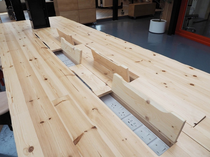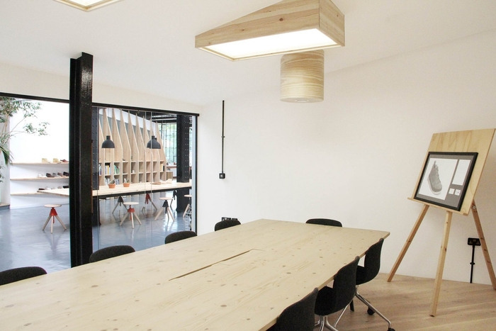 由于这个工业场地的大型原始窗户,开放式工作空间受益于非凡的自然光度。设计师使用旅行手推车创造了可以在现有INP天花板横梁上旋转和滑动的大型软木板。这种多功能的工作环境使员工能够根据自己的需要关闭自己的空间或选择将其打开。#办公室空间设计#