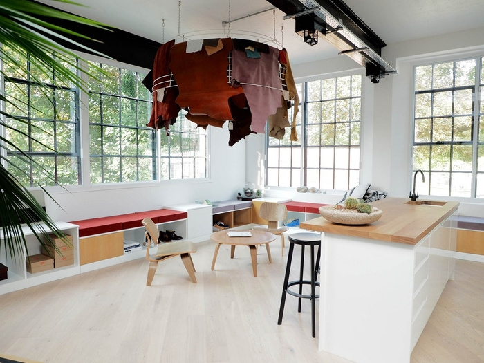 休息区是一个致力于灵感和放松时刻的空间,位于皮革储藏室的对面。休息室被大窗户包围,集成了一个小厨房、一个酒吧、一个角落里的大型储物长凳系统,以及一个专门为这个项目设计的超大吊灯,由金属焊接管制成,各种皮革隐藏在其中挂着。#办公室空间设计公司#