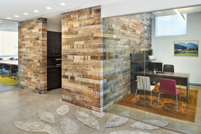 整个办公室设计装修使用的布局和材料至关重要:开放式平面图、玻璃办公室正面和每层楼的公共会议空间促进了员工之间的协作。管理合伙人办公室是一面滑动的玻璃墙,允许开放,鼓励员工自由进出。