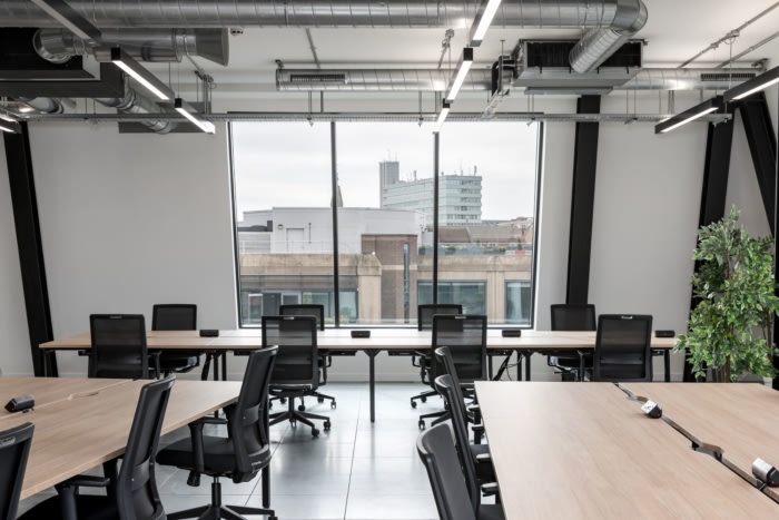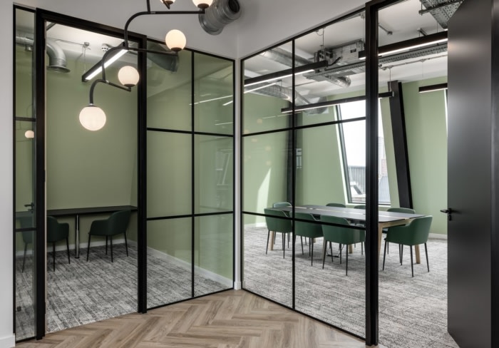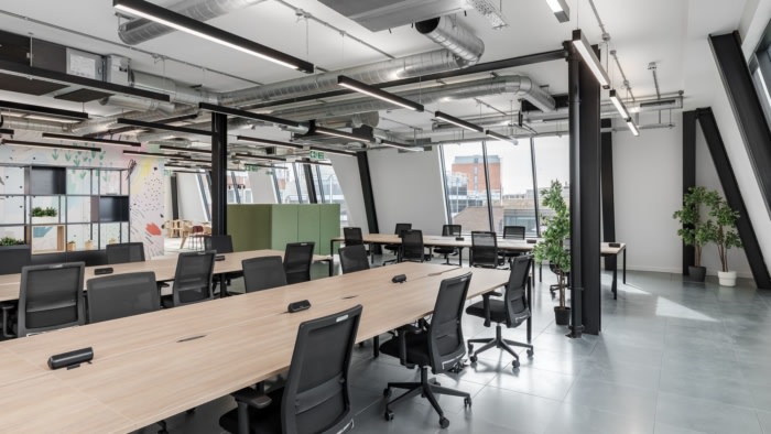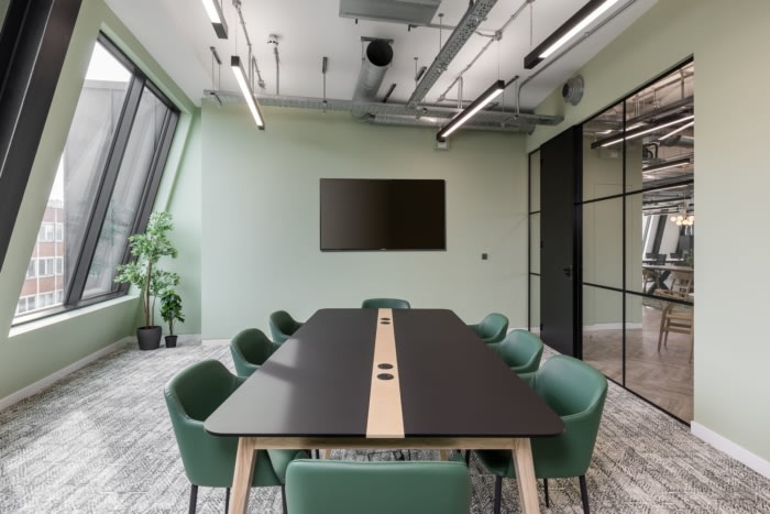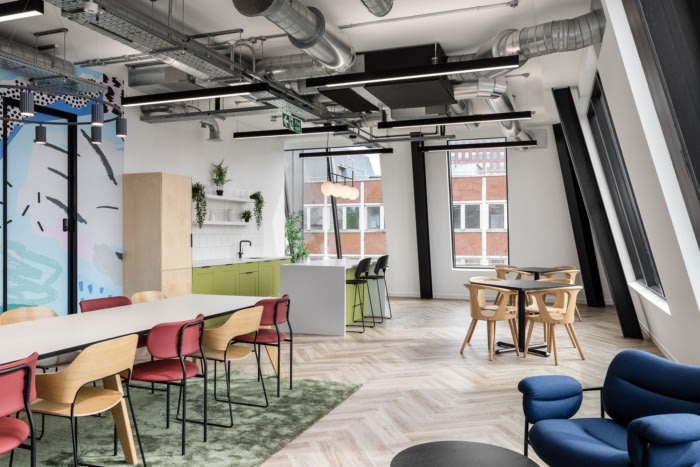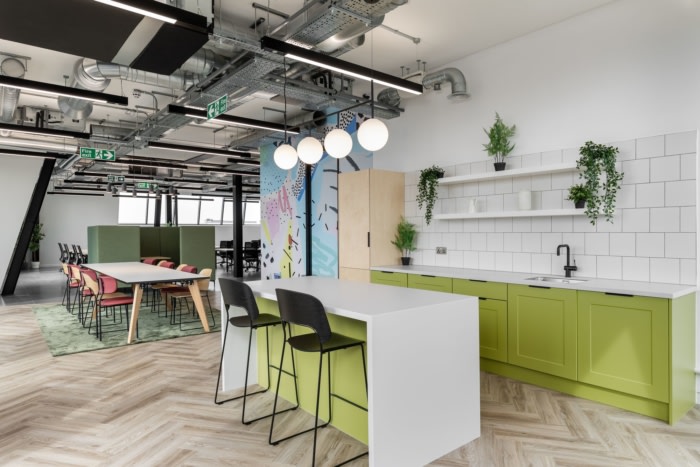 环绕墙壁的醒目图形为空间注入了色彩,旨在给观看该空间的潜在租户留下难忘的第一印象。为了加强设计的视觉冲击力,在定制厨房和休息区安装了特色照明、地铁风格的瓷砖和色彩缤纷的家具。自然色调和材料增添了现代清新的美感,这将吸引许多寻求“即插即用”工作空间的企业,他们可以在搬入后对其进行定制。#企业办公空间设计#