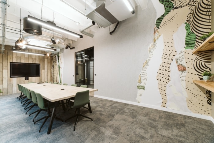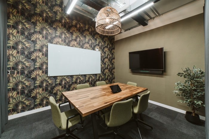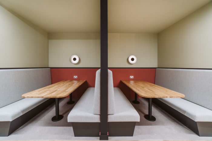 建在对面墙上的双会议室空间宽敞,带有轻松的开心果绿色,与大胆的现代赤土陶器形成鲜明对比。隐藏在墙壁内的是更多的电话亭和吊舱,这些都是为了满足日益增长的虚拟会议需求。#办公室空间设计案例#