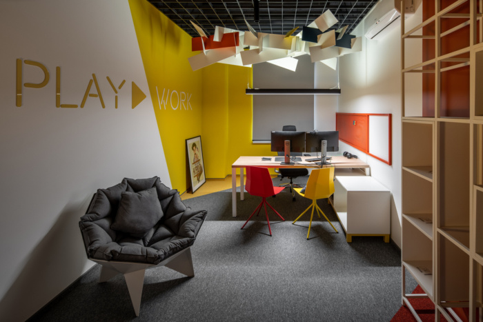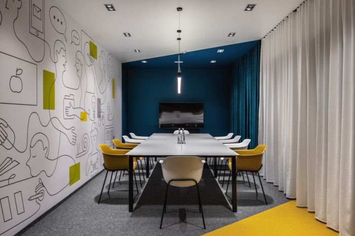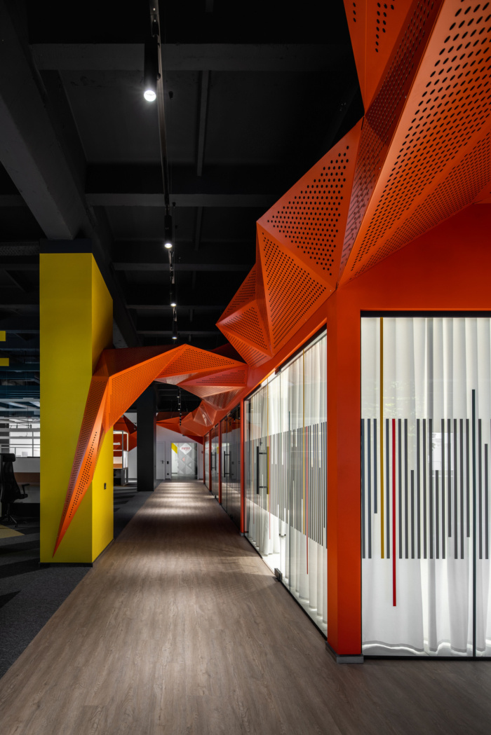 整个空间的色彩选择来自于企业工作环境的俏皮气氛和氛围。橙色、黄色和绿松石色是主要主题,它们有助于对空间进行颜色编码,浅灰色和深灰色背景色有助于突出明亮的色点,并创造出许多吸引眼球的地方。#广州办公室装修公司#