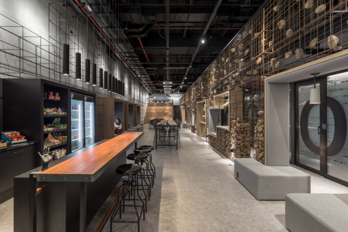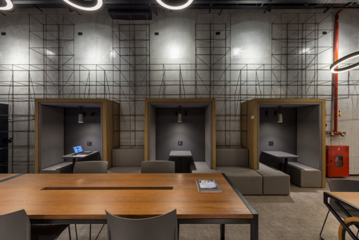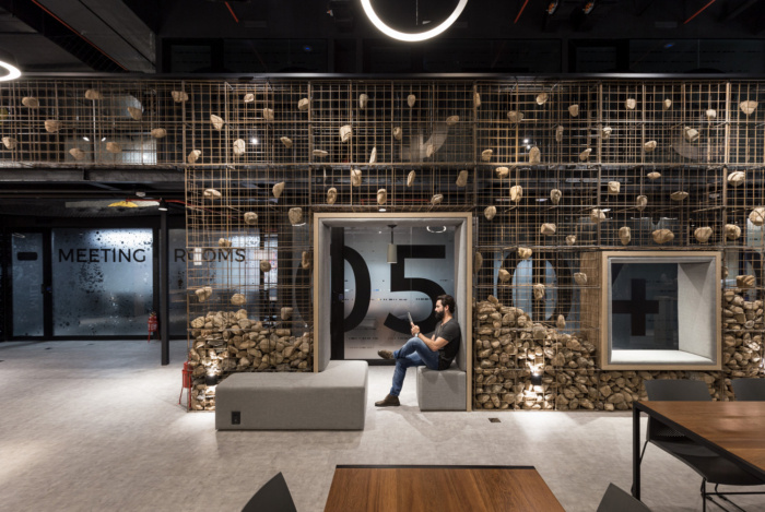 在办公室对面的墙壁上,还有另一种与中央类似的金属结构,虽然没有石头或金属网,但它作为各种产品的展示板。在通往夹层的路上,在看台旁边,有学习的休息空间,短暂的头脑风暴会议室,以及一个减压和阅读的环境,它提供了一张网床,连接在夹层结构的金属梁上,木材和钢材的使用展示了环境的简化和极简主义特征,使用原始的、未改变的工业材料,与商业自动化的最新发展相结合。#办公室装修设计方案#