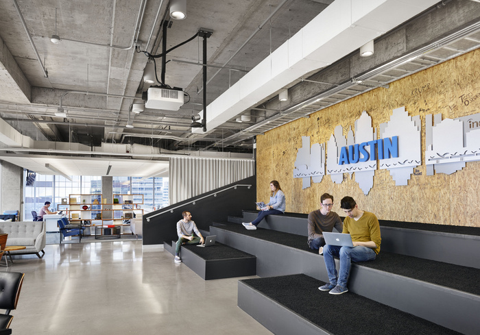 该空间提供了一个大型餐厅、游戏区、开放式办公室布局和各种协作空间,以扩展定义企业位于奥斯汀山区的总部的文化,设计师也帮助创建了一个空间。渐变的平台座位营造出公共氛围,而锣允许员工庆祝实现销售目标,因为他们选择的“主题曲”通过头顶扬声器播放。#广州办公室装修公司#