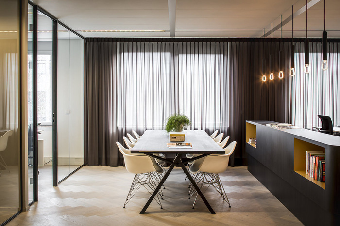 对于他们的员工来说,他们想要一个开放和透明的内部空间,他们可以在其中轻松地切换到另一个工作区/工作站。精致的细节是木地板,铺成“人字形”图案,无缝地变成具有相同图案的地毯。#办公室装修公司#