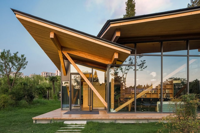 四周用到全开敞玻璃墙,使建筑与周边的环境得以进行充分的视线沟通,上部两片有悬浮感的双曲屋面强化了水平向的交流,全木材构成的外结构、家具以及支撑,更拉近了和室外的距离,让人们可以在此安心的看书。