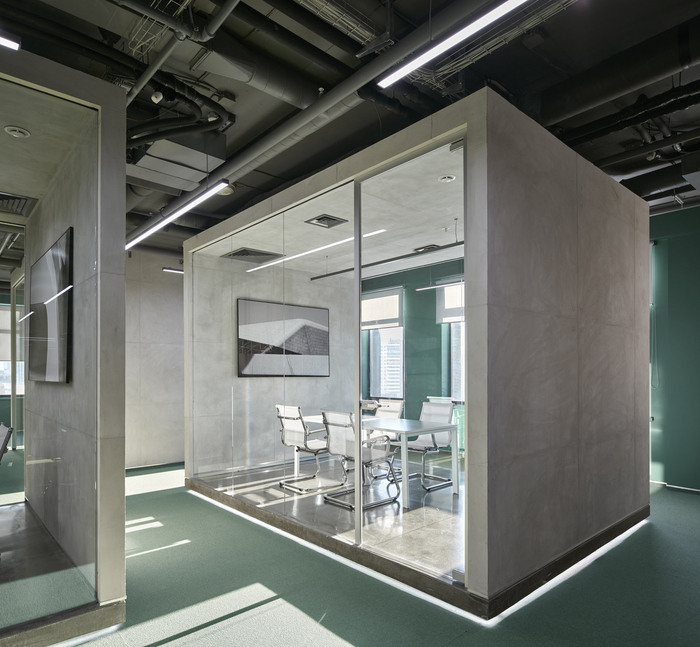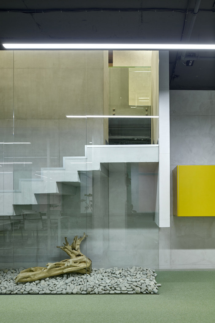 办公楼空间布局是作为对简报的合理回答而创建的。会议室由玻璃和混凝土制成,在一楼开放空间的低平台上稍微抬高了一点。最大的一个是大型项目团队的主会议室。工作站主要位于建筑物周边,采光充足?;嵋槭业耐该魈辶看丛炝税旃占浣峁?,并保持了能见度和良好的日照。#办公楼装修公司#