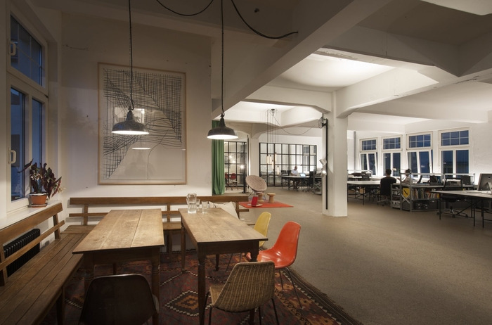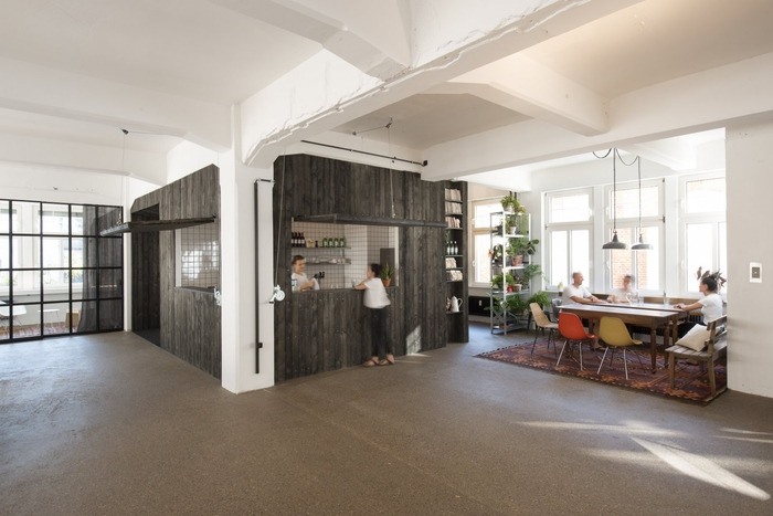 凭借其白色的混凝土框架,单层办公空间具有清晰的工业空气,这要归功于定义中轴的结构柱。房间的尽头是深色钢架玻璃会议室。每个后面都是办公室和会议室。这种对建筑物工业历史的参考反映在其巨大的窗户上,这些窗户允许自然光从外面流入,并提供外面庭院的广阔视野。#广州办公室装修设计#