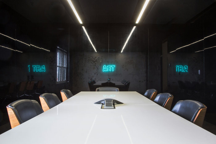 现有的木地板已损坏无法修复,无法打捞。没有用新的等价物复制这些,而是将其视为创造独特事物的机会,并引入了一个 1.2mx 2.4m 染色梅兰蒂胶合板??樽魑善繁砻?。面板的大小增强了空间的规模,并在整个楼层以重复的交错图案布置,创造了一个网格,给出了秩序,并建立了一个处理信息流的合理框架,即霓虹灯。镜面墙板与地板的模块尺寸相同,并与梅兰蒂胶合板地板精确对齐,进一步增强了秩序。#厂房办公楼设计装修#
