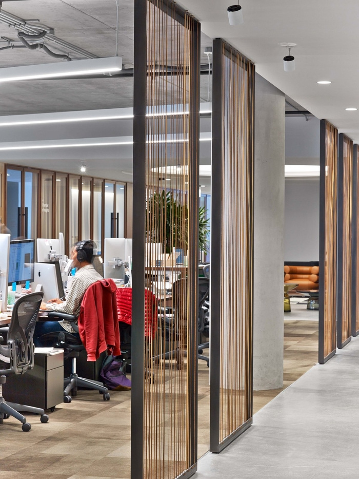 即使您在街上走过,大厅也邀请您进来探索,巨大的镜子打破了内外之间的区别。这样做,它们反映了公司的核心价值观之一:无限深度的存储和可能性。另请参阅悬挂在大堂头顶的大型陆地苔藓球,这表明这是一个不断发展的空间。#办公室装修公司#