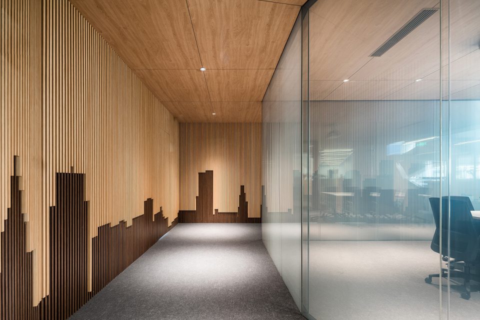 木楼梯是这栋楼的交通流线灵魂,它连接了所有的空间层,公共走道用现代感较强的深灰色作为主色调,会议室相对私密的走道用木质材质为主,形成了空间的包裹感受。核心办公区的楼层则更精彩,以建造和工业感为线索,在空间设计中以上海这座大都市城市天际线为设计元素,同时工业化的办公楼装修体现了建造行业龙头企业的特点,也反应出了这座城市的形象。