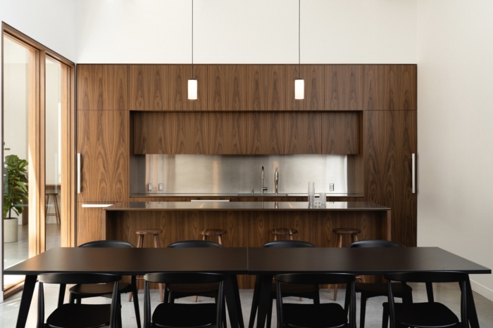 该计划通过两个机翼展开,分别托管一个公共客户区和一个更私密的员工区。这种分布允许团队拥有更大的亲密感和自由度,以鼓励放松和归属感。浅色调、朴素的饰面和休闲家具的选择突出了轻松的氛围。设计师在开放式办公室和封闭式会议室的传统模式之间开发了一种混合概念,设计了灵活的布局,优化了平方英尺,同时促进了团队合作和生产力。#办公楼装修方案#