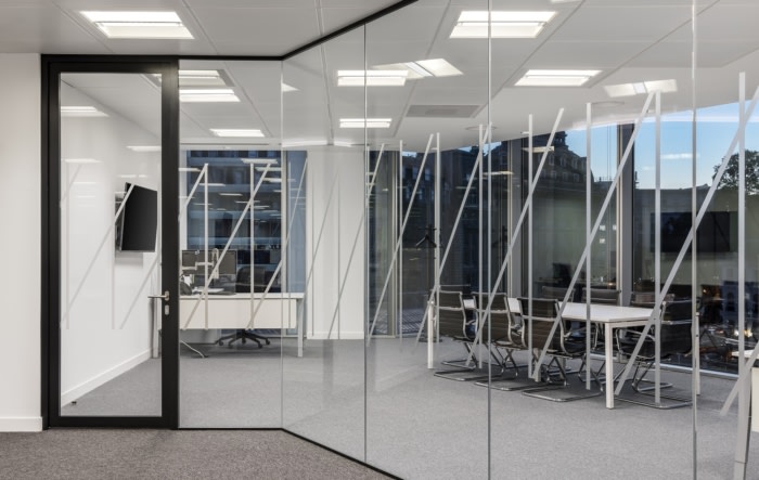 办公室装修:时尚的灰色调色板和企业的标志性绿色参考了它们与自然世界的联系