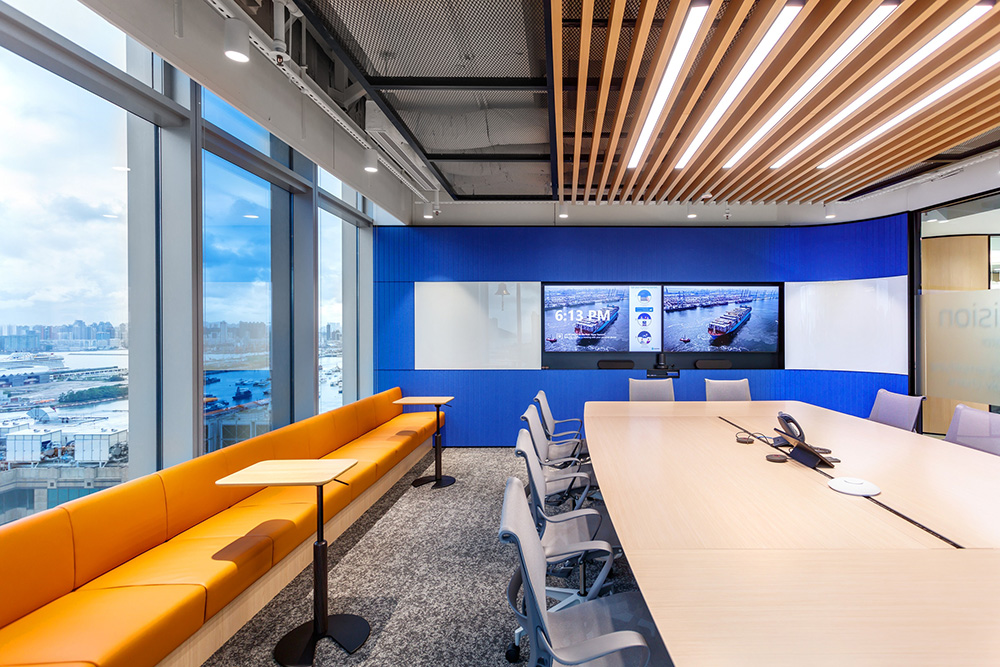 会议区适用于团队讨论并做出重要决策,因此这里将顶尖的视频会议和I.T.设备系统集合到空间设计中。社区型的概念布局,将有助于马士基香港团队在未来数年的壮大发展和人才吸纳。#凯悦建设-装修设计#