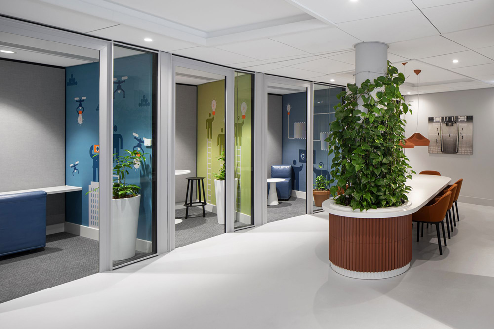 完成后的办公室清晰、简洁、易读。这处办公室原来的装修厚重且晦暗。在开发整体视觉概念的时候,决定尽可能保留原来的结构和施工的完整性,以满足尽可能减少使用新材料的可持续性目标,但它们都被赋予了全新的浅灰色饰面。简洁明亮的浅灰色背景正好映衬着来自Osborne Clarke自身为灵感的丰富多彩的元素。包括使用令人惊叹的可持续材料,如铸造陶瓷砖,以其充满韵律的肌理形式创建了一个极富视觉美感的空间。在一楼和整个办公室里,大而圆的陶瓷元素的构造,营造出温馨如家的空间氛围,令整个场所散发出独具匠心的工艺质感和精美细节。圆形的构造与光滑和简洁的建筑风格形成了鲜明的对比。#空间设计装修#