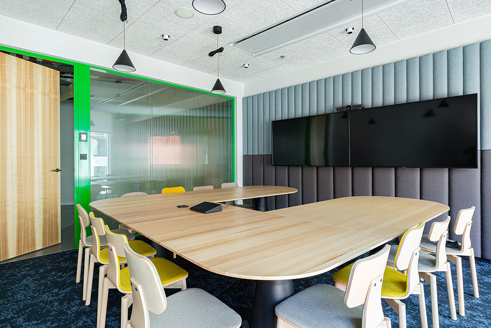 醒目的绿色配以独特的白蜡木饰面板,碰撞出一个极具视觉冲击力的空间感知。强烈的色彩碰撞、独特的墙面插画、好玩有趣的家具、香蕉形的办公桌,甚至还引入了桑拿室和纳尼亚酒吧设计,让这个初创科技企业的办公室充满了奇趣和创意氛围。#办公室室内设计#