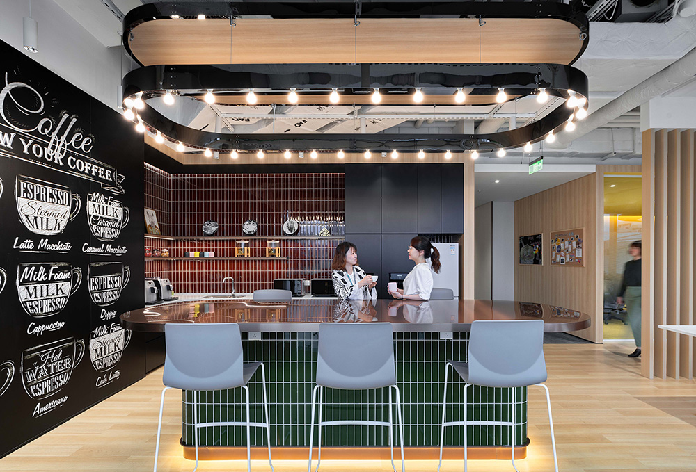 特殊的大楼构造对于空间设计来说既是挑战,也是机遇。因此设计师将其中的半层设计成另一个独立的空间,通过旋转阶梯相连结。同时选择轻量化的夹层让空间的高度得到最大化,并且毫不影响环境的舒适性。另外,夹层的隔音问题也通过隔音橡胶垫得到了妥善的解决。咖啡厅与开放区的融合设计,以绿色打底,其他颜色为辅,打造一个全新的服务于用户的“光合空间”,这样融合的色彩搭配更是凸显了包容的态度与想法。#办公室装修设计#