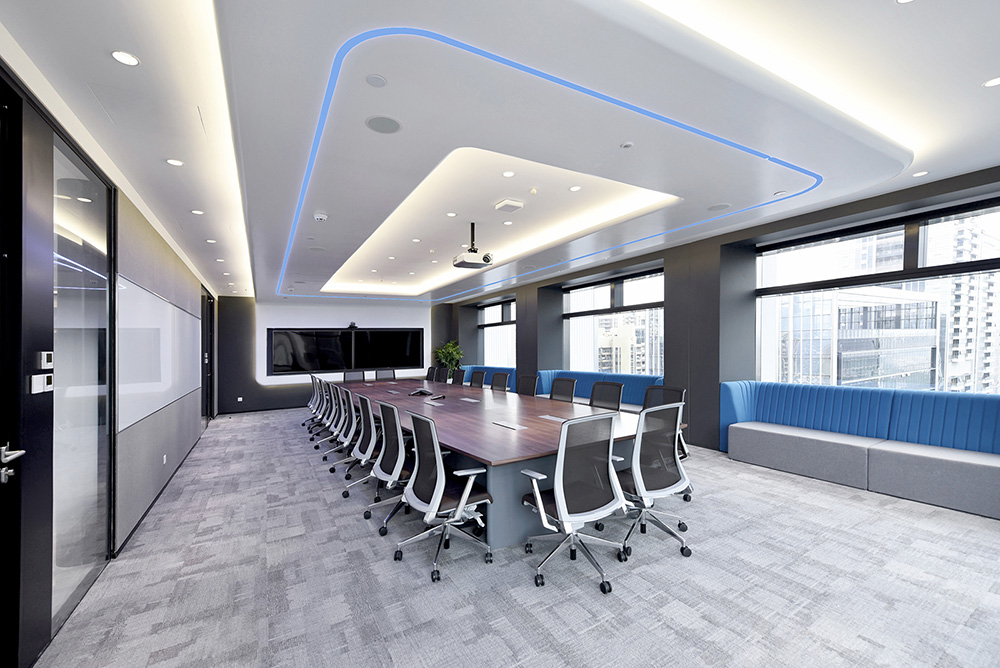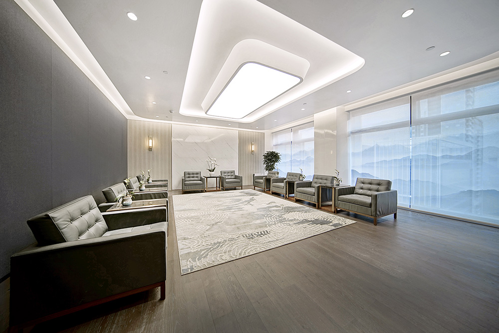 主茶水间位于前厅西侧,兼顾活动室功能;休闲设施一应俱全。地面的BOLON编织地毯呈鳞片状铺装,随着光线和视角的改变呈现出绚烂的色彩;家具的围合形成不同的组团:茶歇、浅谈、简餐、阅读,游戏……。虽然置身万象天地腹地,其中休闲餐饮选择不胜枚举,但是店家再有诱惑的茶点也抵不过享用一杯自己亲手调制的咖啡感觉惬意……家的归属感难以抵挡。;设计的语言仍然是“直”与“曲”的变化,但色彩的丰富使情绪热烈起来。#设计装修案例#