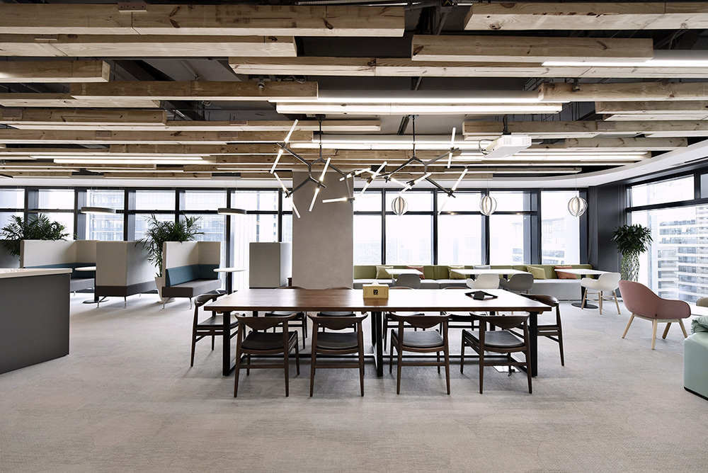 地面的BOLON编织地毯呈鳞片状铺装,随着光线和视角的改变呈现出绚烂的色彩;家具的围合形成不同的组团:茶歇、浅谈、简餐、阅读,游戏……。虽然置身万象天地腹地,其中休闲餐饮选择不胜枚举,但是店家再有诱惑的茶点也抵不过享用一杯自己亲手调制的咖啡感觉惬意……家的归属感难以抵挡。#办公室室内设计#
