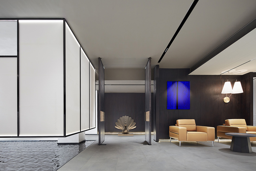 打破传统办公单一拘谨的氛围,利用轻盈、自然的材质,满足参观者和使用者的不同需求,彰显企业精神与文化归属。进入前厅,黑色造型背景墙与白色亚克力接待台将视野带入整个空间,采用隔而不断的方法打造空间的围合形式,制造空间视觉通透感。仿生水景与轻质格栅呼应,形成流动的倒影,拓宽了空间的立体维度,打破了单一的界面语言。富有变化的网格造型让前厅于虚实之间自如转换,黑白相间,独具艺术视觉体验。#写字楼设计装修#