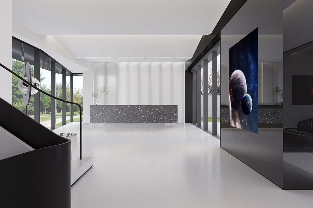 两侧落地开窗实现无限延伸,空间的边界更加柔软,内庭院成为接待区的装饰景观,前台及背景以“帆”这一意象表达对于宇宙世界探索的起航。树脂地坪的无接缝特性解决了材质拼接的繁琐,让空间更加纯粹简洁。抛却繁复的装饰,空间的节奏、韵律、构成形式,通过激发人的体验而产生心灵的感受,天光和绿意就像是柔软的曲调,遥望内庭院,静听鸟鸣风吹和雨水低落的声音,在细微之处抚慰躁动不安的城市灵魂。#凯悦装饰-办公装修#
