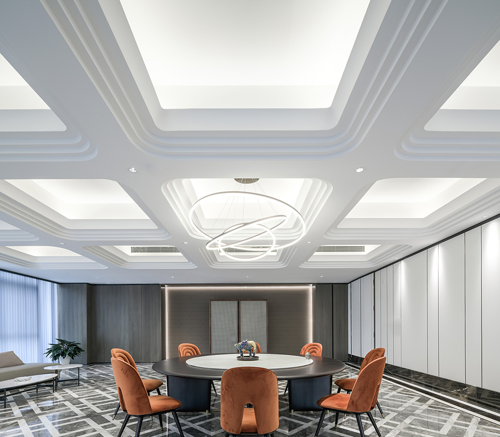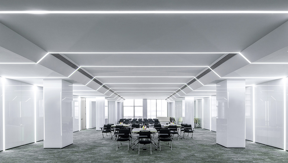 通过审视空间条件,思考空间顶部及整体标高的设计。结合现场复杂的梁归纳设备贴梁走管,形成不规则方块形。通过发光膜模拟天光效果,营造沐浴“阳光”下办公空间氛围感。重新思考现代工作的场景。打造的不是像咖啡馆那样一待就很久的空间,而是一个有更多活动和交流、更加积极主动、使人们自然而然地受到更多协作方式。#空间设计装修#