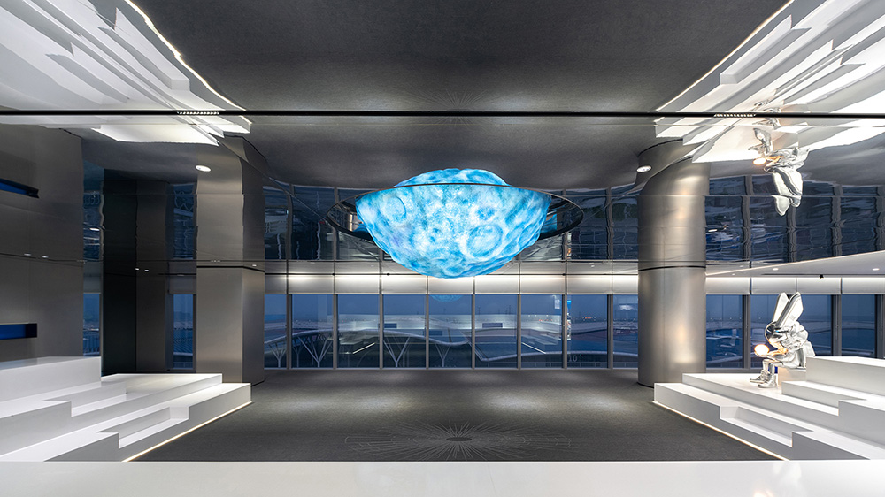 在这片面向未来和世界的窗口之地,会展湾里岸是少有的、占据稀缺资源和优越地段的封面办公产品。甲方希望人们直观感受产品优势,并为此选择了景观面最好的朝向。连天接海的会展湾一望无垠,全球最大会展中心蓝紫色的海浪型屋面上,彩色丝带蜿蜒其中,像一条为怀抱梦想的人们铺就的海上丝路,当步入展示空间,如此恢弘的景象便闯入他们的眼睛。#空间设计案例#