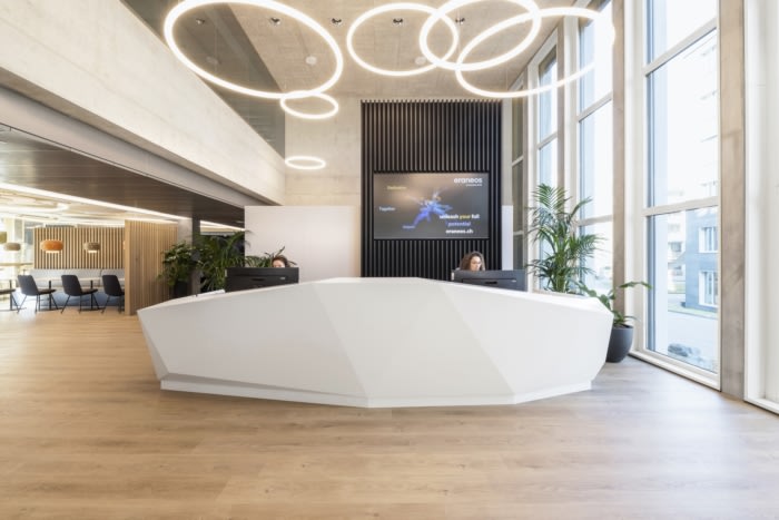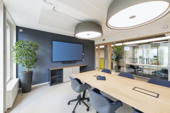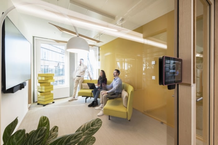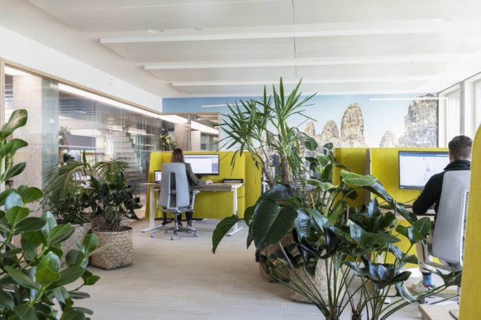 为了满足在线视频通话和噪音敏感度的需求,每层楼都点缀着声学室和房间,以便集中工作。每间安静的工作室都采用描绘联合国教科文组织世界遗产的落地墙图形,实现了个性化设计。丰富的室内植物增添了额外的平静感并提高生产力。#办公楼装修#