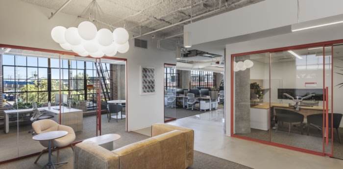 在完全虚拟的设计过程中,企业有意选择了一个底层空间,使其能够直接与沿街景拥抱的洛杉矶市中心社区互动。品牌细节和办公室运营现在从街上可以看到——当地艺术家的彩色壁画装饰着整个墙壁——而卷帘车库门通向延伸办公室的露台。#办公室装修#