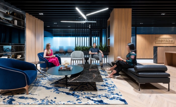 最大的设计时刻之一是戏剧性的特色墙,它耸立在咖啡馆旁光滑的石英楼梯后面,连接12楼和14楼,创造了令人惊叹的视觉联系。该装置以Avocatus大理石完成,表达了运动和生命,深脉唤起了蝴蝶,花瓣和飞鸟的图像。螺纹杆将地板之间的整个高度延伸,增强了设计的凝聚力。#公司办公室装修案例#