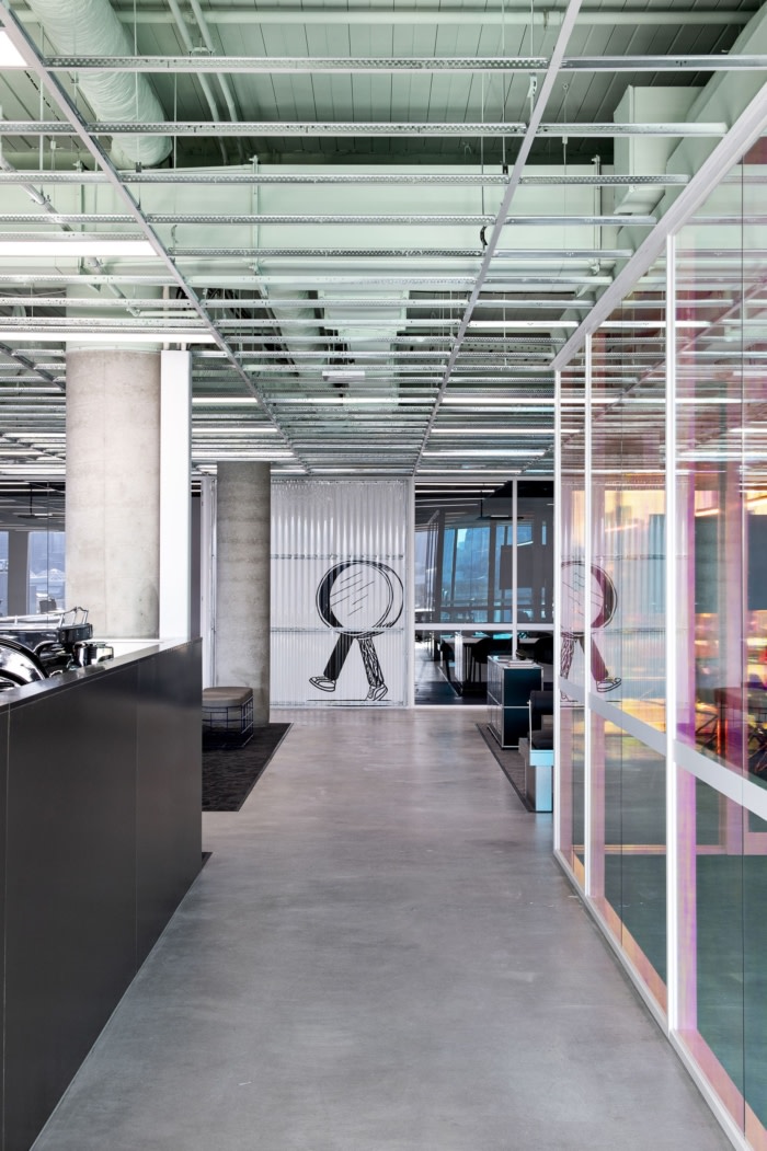 将网格留在原地,移除瓷砖,使它们可以在建筑物内的其他装修中重复使用,并在天花板上喷出柔和的绿色“超出”网格。在一个喷洒白色、黑色或大胆色彩的世界里,让人感受到一种高度柔和的绿色表达了创意产业中最优秀的人所要求的克制程度,抓住了永不走得太远的精髓。通过使用一些原始建筑材料,自然感同样得到了很好的利用,与空间的精致和科技般的感觉形成了鲜明的对比。#办公室装修设计公司#