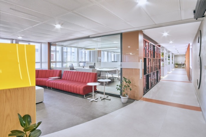 在这个鲜艳色彩占主导地位的地方,色彩场景体现在家具、照明元素、地板和墙面等基本物品中。一条多色的移动链条,用于围绕地板画廊空间的阴影;是最引人注目的例子之一。此外,建筑师更喜欢使用不同的颜色来分隔具有不同功能的部分,例如工作和休息区以及行政单元。#办公室装修设计公司#