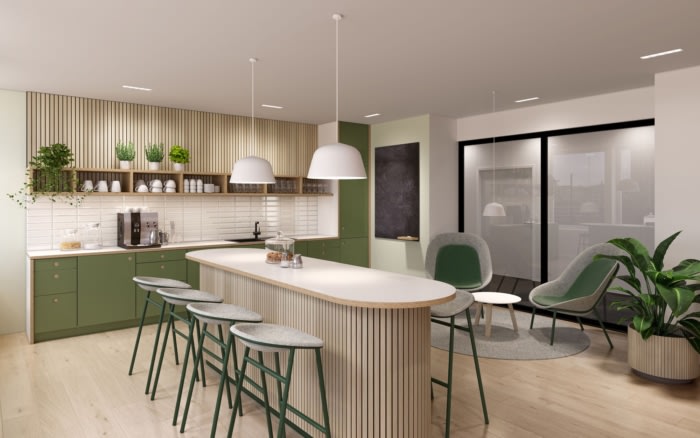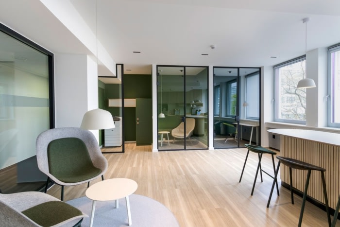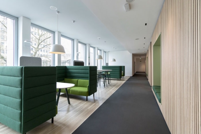 2楼和3楼的办公空间经过优化,为茶园厨房创造了宽敞的区域。这为会议和交流创造了额外的空间。此外,每层楼的电话亭都提供了撤退电话的可能性。现代且符合人体工程学的家具系统采用品牌典型的颜色和材料概念,在众多办公空间中营造出统一的外观。#办公楼装修设计案例#