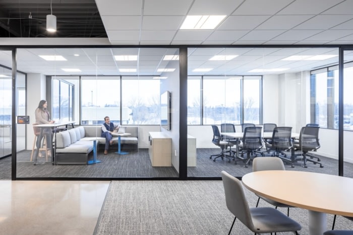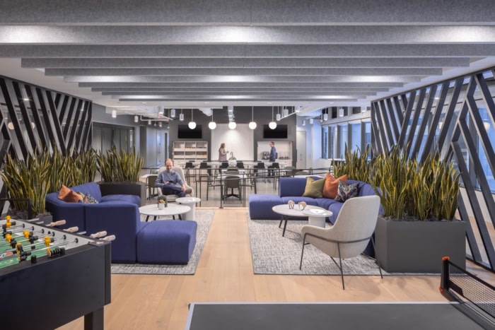 该空间采用时尚中性的建筑色调,充足的日光和天然橡木,对员工和客人都具有吸引力。热情好客的办公室包括一个游戏和休息室平台,营造出轻松、协作的氛围。同样,接待处可以直接看到咖啡厅和相邻的培训室,用于招待员工和客户。#办公室设计装修#