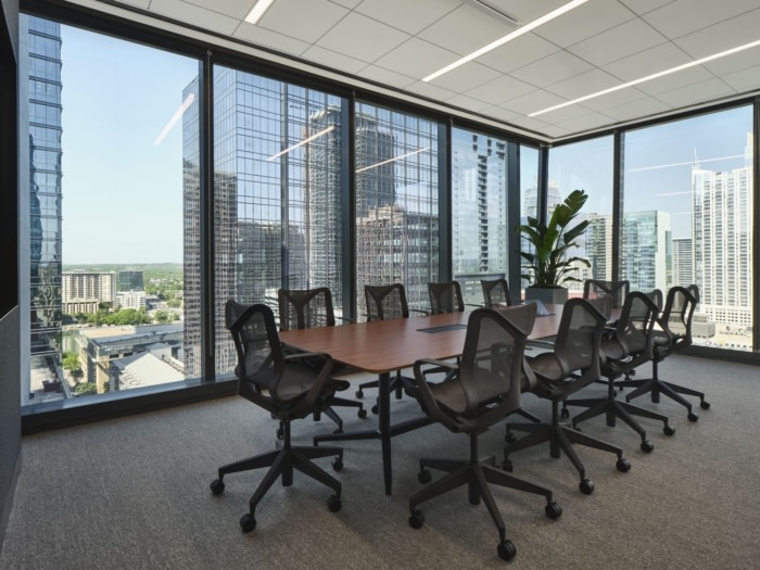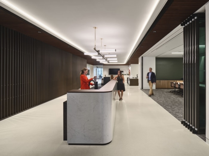 材料代表自己,通过其美丽、诚实和触感吸引用户。柔和的边缘、曲线几何形状和线性元素并置,创造了一个专业而诱人、平易近人但可靠、敏捷但专注、微妙优雅但大胆的定制工作场所。#办公室空间设计装修公司#