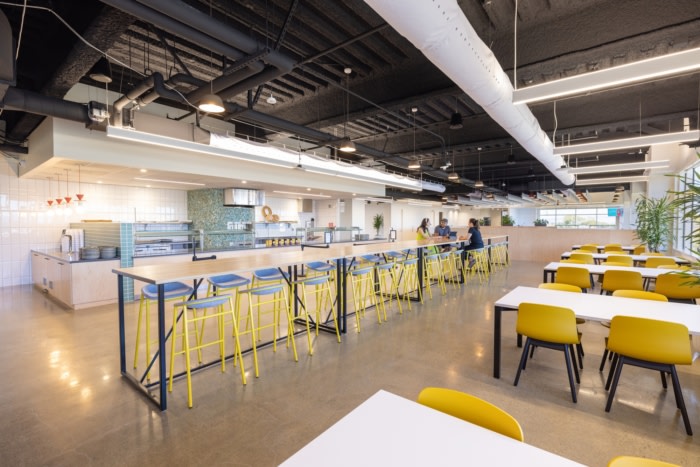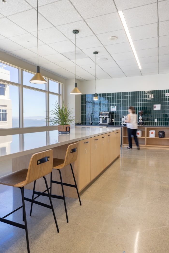 在111,000平方英尺的工作场所中,保持了极简的美学,以强调旧金山湾的景色,并创造了一个开放、明亮和灵活的工作场所,支持敏捷工作??突ё钕冉目Х忍浔噶俗ㄒ档呐脞客哦?,并为员工提供白天不同餐点的选择,包括定制的工匠披萨站。#办公室空间设计#