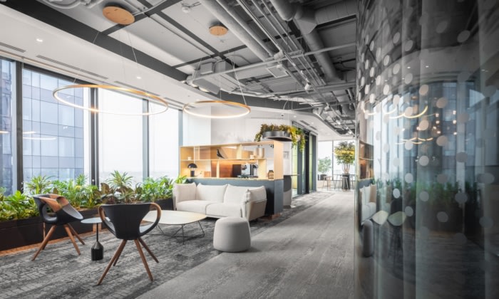 办公室空间设计:公共地板的总体外观和感觉的特点是优雅的中性色调