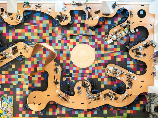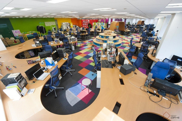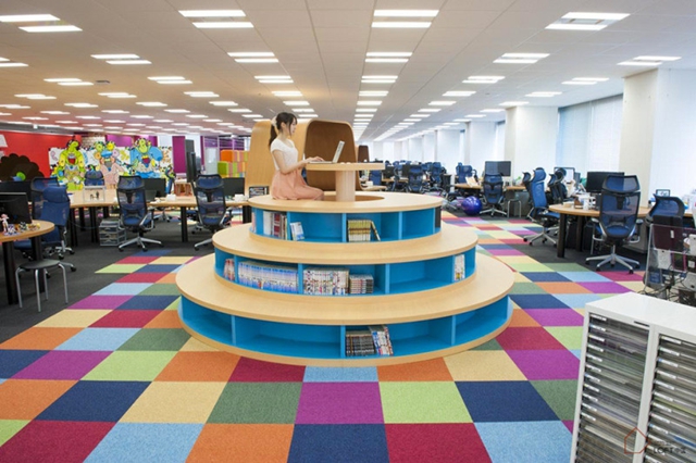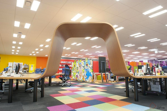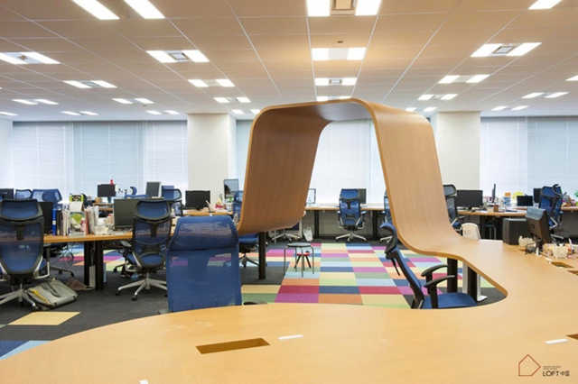 分享一个来自日本的办公室装修,亮点有三:家具,形状,色彩,这三样可谓最重要的部分。这家公司称Pixiv,他们拥有700万用户的插画作品分享网站,从他们的墙面图案可以看出来,这些人中,汇集了插图画家、设计师还有别的艺术爱好者。装修总是和品牌或行业有些关系,这个平台是供分享的,艺术海洋,独特,自由,随性,而办公室也要是多彩而明亮的,能让人有一种被惊艳的感觉。大片的夸张造型营造出轻松的氛围,定制的办公桌就像是桥梁,可以连接共享,办公室里仅有一张桌子,长达250米,没有分区,没有定义明确的私人空间,员工可以自由无阻地沟通交流,真正的开放式。